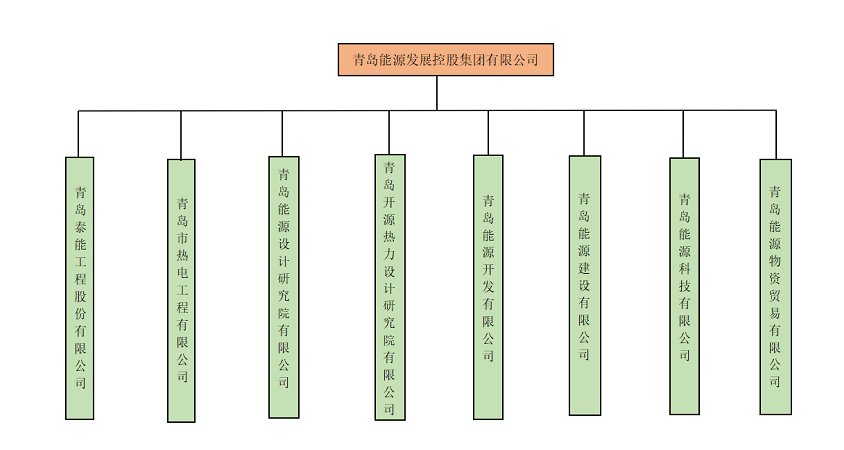 公司本部设有办公室、组织人事处、企业管理处、工程管理处、财务管理处、安全与质量管理处、物资管理处、审计监察处8个职能处室。下辖青岛能源设计研究院有限公司(含热力设计院、燃气设计院、清洁能源院)、青岛泰能工程股份有限公司、青岛市热电工程有限公司、青岛能源建设有限公司、青岛能源开发有限公司、青岛能源科技有限公司、物资贸易分公司7个子(分)公司。