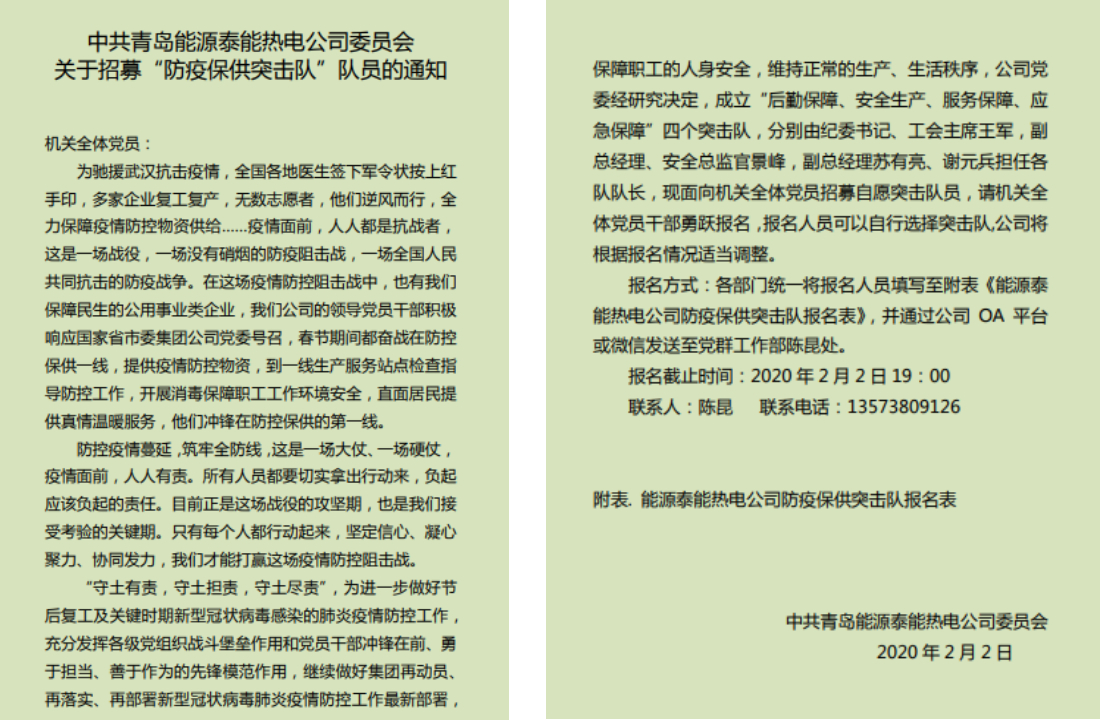 泰能热电建立多支突击队,防疫工作抓实到一线