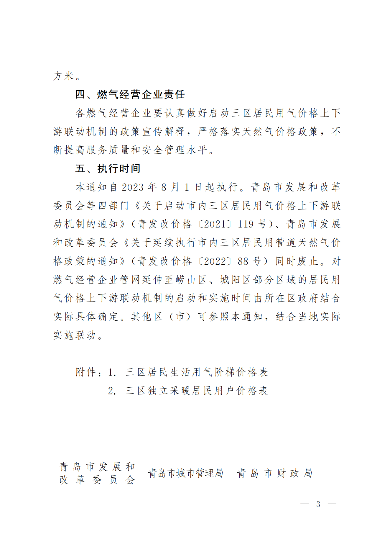 青发改价格【2023】194号青岛市发展和改革委员会 青岛市城市管理局 青岛市财政局 青岛市民政局 关于启动三区居民用气价格上下游联动机制的通知