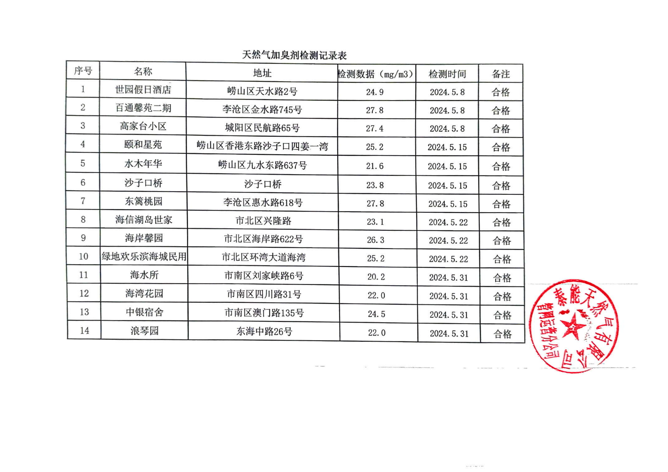 天然气加臭剂检测记录表(2024年5月)